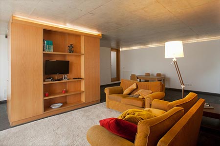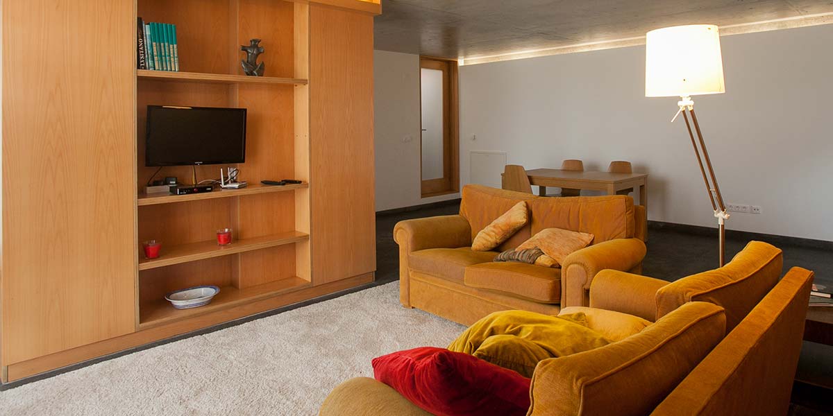 The Arch House is a modern 70 m2 apartment with no doors dividing its areas, with a bedroom, living and dining rooms, bathroom and kitchen equipped with a fridge, cooker, microwave oven, toaster and coffee machine. There is internet access in the whole apartment. The living room has a TV with several channels. All the windows extend from the floor to the ceiling and open directly to a courtyard, where there is a table for meals and a hammock.